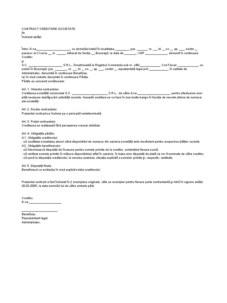 Societatea b finanteaza societatea a cu o suma de 120.000 lei pe perioada a doi ani de. Download formular model de contract de creditare firma societate de catre asociat in format pdf, word, doc,. Scopul societăţii, aporturile sociale, modul de repartizare a beneficiilor şi pierderilor, durata societăţii etc. 99/1999 şi în conformitate cu legea 31/1990 (republicată), cu respectarea următoarelor clauze Activitati de camatarie, creditare societate, creditare societate cu dobanda, dobanda imprumut societate, imprumut impozitare contract cu timp partial.