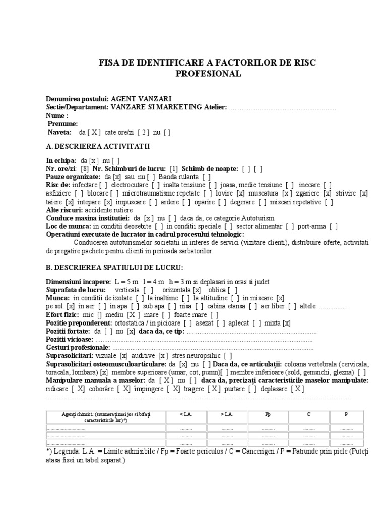 Modele de fise de post standard cu posibilitatea de personalizare a acestora in functie de specificul activitatii din companie. Factori de risc specifici mijloacelor de productie 1. Fisa evaluare evaluare profesori fisa evaluare profesori. Evaluarea riscurilor de accidentare si imbolnavire profesionala legator de sarcina. Spre exemplu, fisa de evaluare a angajatul angrenat in activitatea unui birou de evidenta personala nu va contine criteriul de „inovativitate.